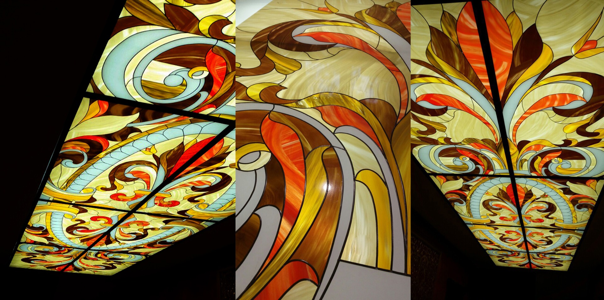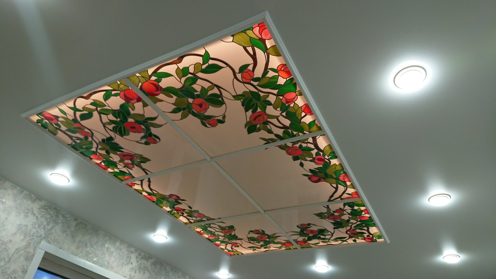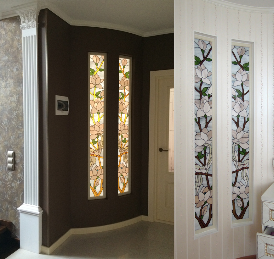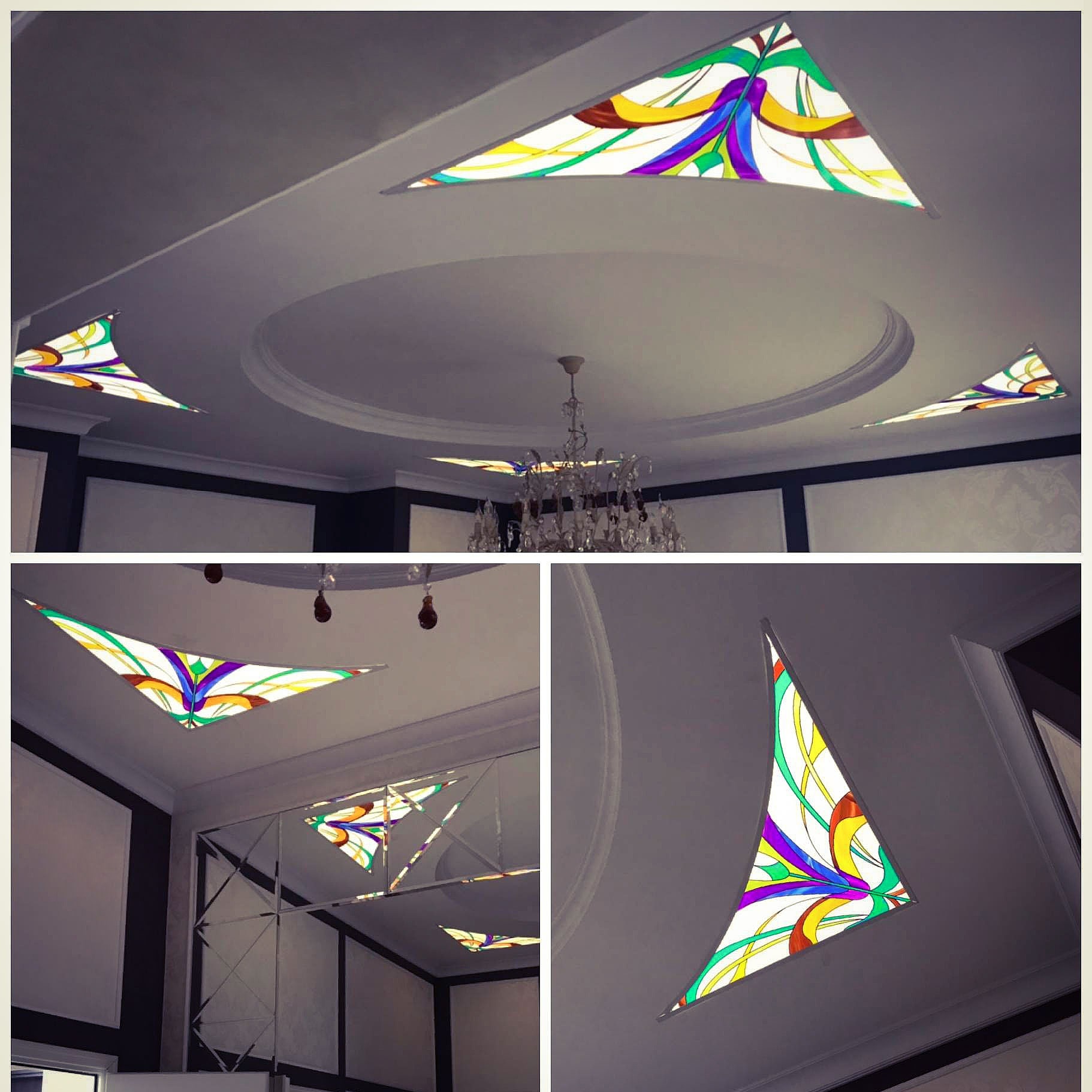 При качественном исполнении пленочный витраж производит не менее достойное впечатление, а также обладает рядом преимуществ перед классическим витражом. Например, это возможность сборки в стеклопакеты без нарушения свойств, это гибкость линий в дизайне. Пленочный витраж - оптимальный вариант для установки в подвесные потолки, т.к. имеет небольшой вес.