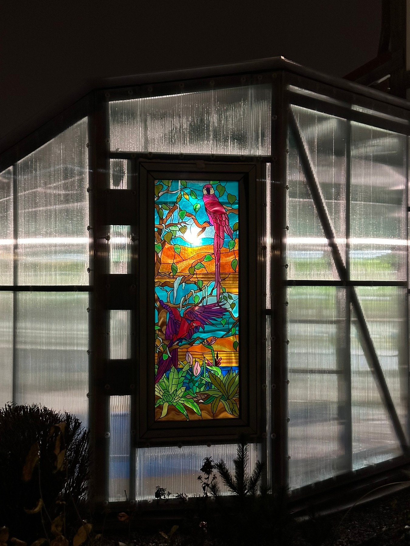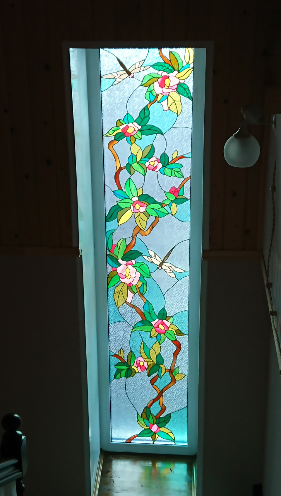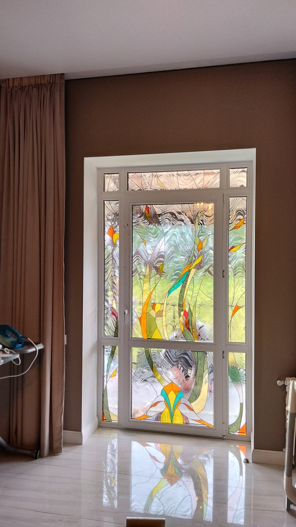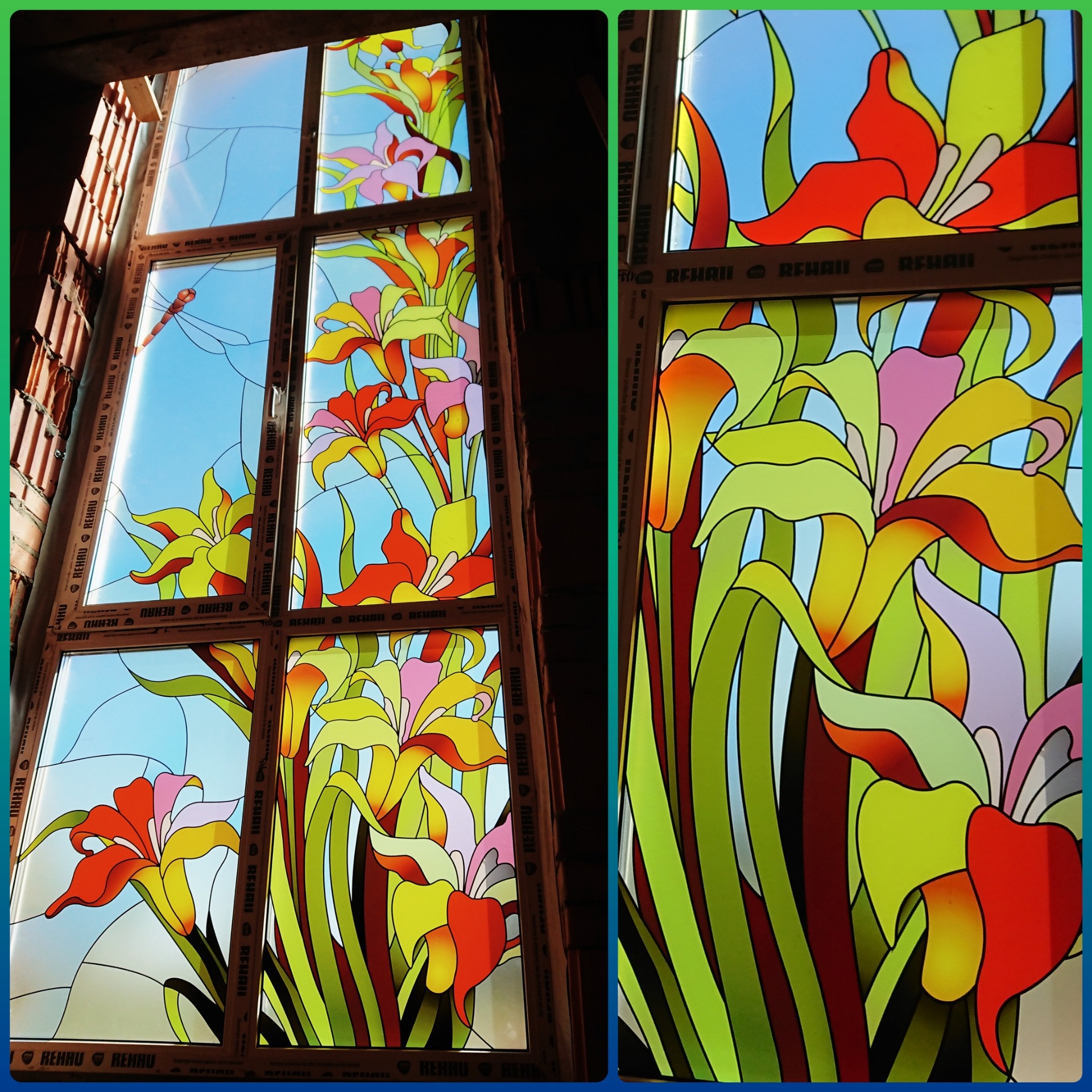 Пленочный витраж - техника, возникшая в 70-х годах XX века. Это имитация классического витража, которая стала очень популярной и получила повсеместное распространение благодаря невысокой цене исполнения. Пленочный витраж изготавливается на листовом стекле, обычном или акриловом. На стекло наклеиваются специальные цветные пленки и свинцовый профиль.