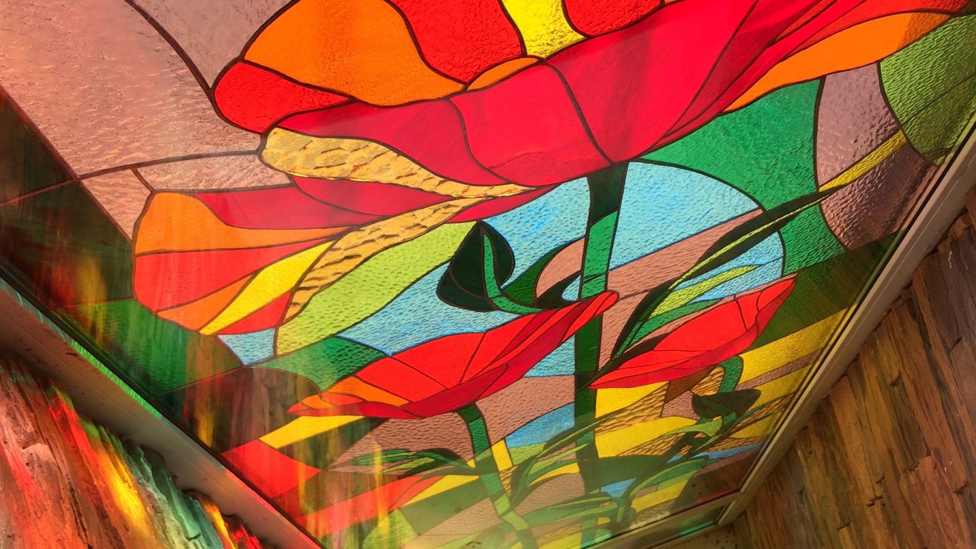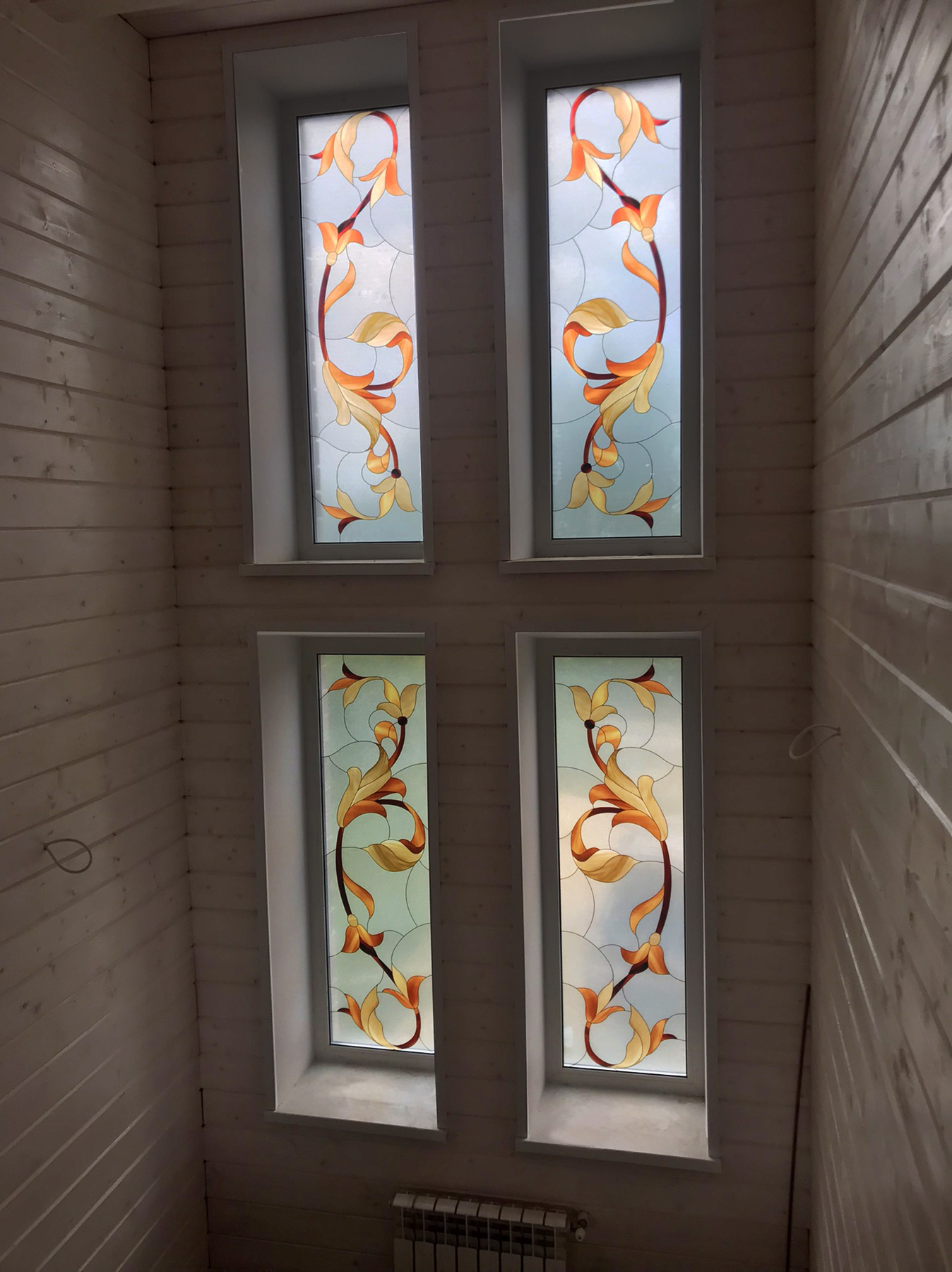 Витраж Тиффани в окне лесничного пролёта "цветочная абстракция".
